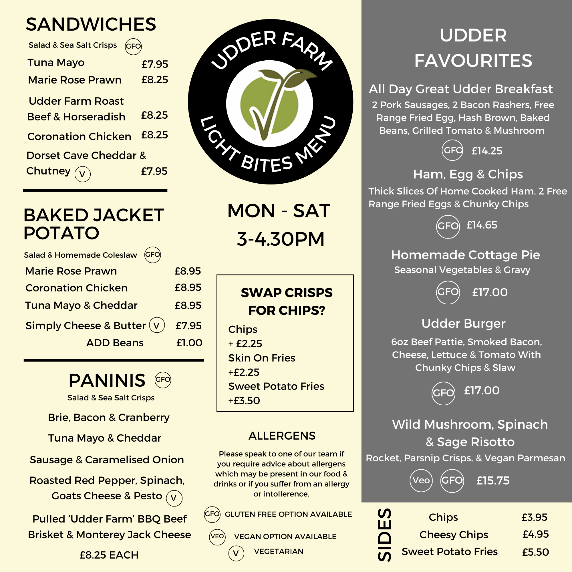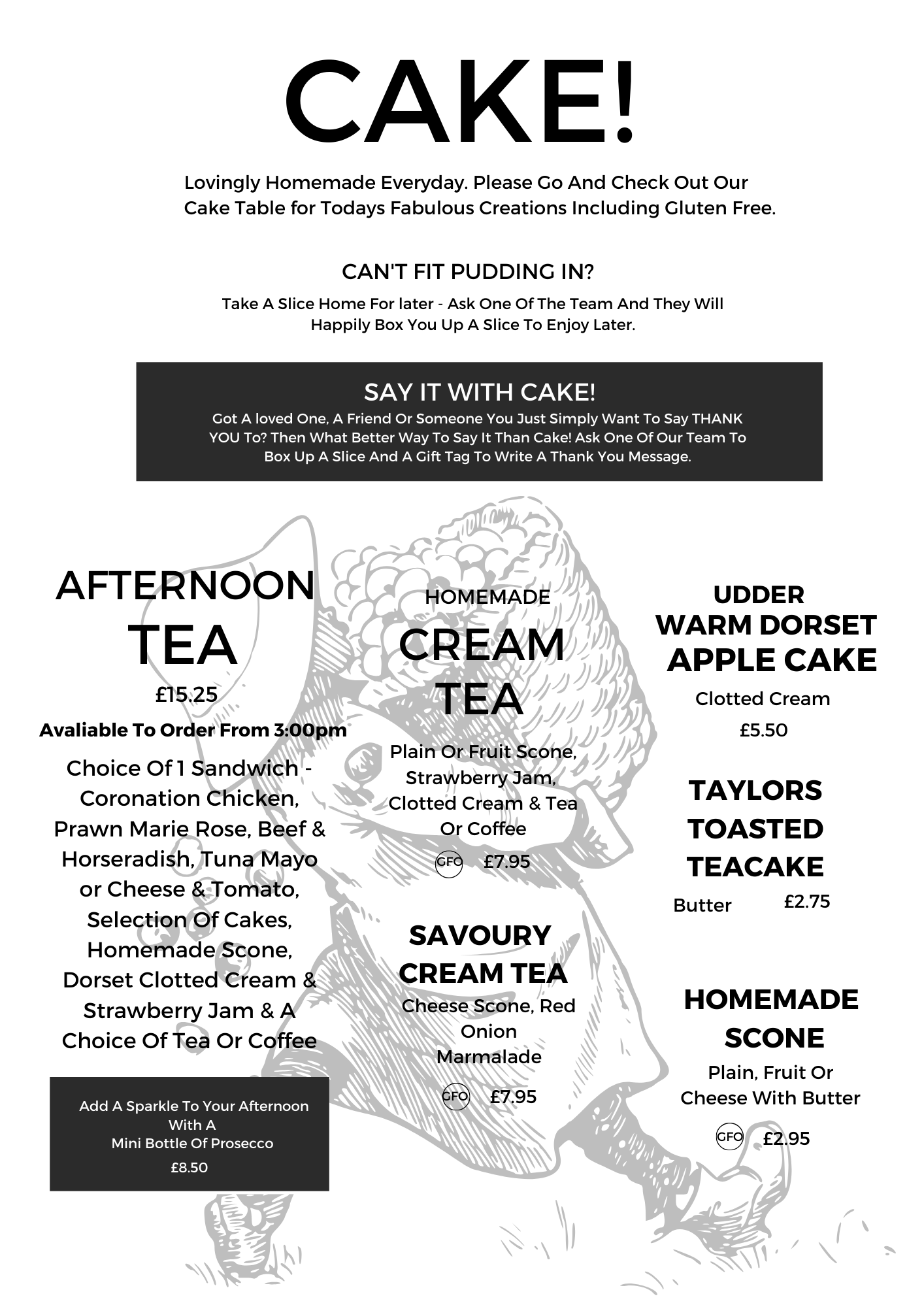 Our Breakfast Menu is served until 11:30 and our Main Menu to be served from 12:00.If you’d like a closer look at what some of our meals look like, click ~ here ~ to see our food gallery! Breakfast Menu Lunchtime Menu Pudding menu drinks menu sunday menu Light Bites menu(3PM-4:30PM ON mONDAY - SATURDAY) kids menu